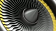 4k animation of seamless loop. Black stainless steel jet engine blades. Close-up view of rotation turbine from turbojet airplane engine.
