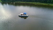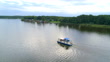 Aerial panning tilt up shot of tourists riding in house boat during vacation, drone flying over lake on sunny day - Scenic view of Muritz lake