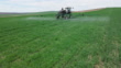 Aerial view of tractor fertilizing green wheat field. - 4K stock video