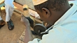 BUJUMBURA, BURUNDI - 2012: WS African man cobbling shoes on side of road. Burundi gained it's full independence in 1962 having been a Belgian colony from 1916. In 1972 there was a major outbreak of violence between the Hutu and Tutsi tribes.