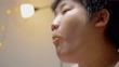Asian boy eating pizza in the night time at home, lifestyle concept.