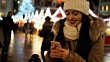 Young woman in winter clothing is standing in the middle of the street and using her phone for messaging in historical part of Bratislava city in winter night. She is smiling. There is glowing blurred Christmas lights decoration and falling snow in the background. Whole scene is illuminated just by artificial light. Low depth of field and blurred background. Close-up. Half speed.
