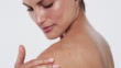 Beautiful woman massages exfoliator into her bare shoulder against white background - 4K stock video