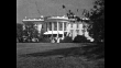 WS beauty shot EXT White House and lawn / side shot Theodore Roosevelt, wearing a black armband, speaks from platform decorated with striped bunting at event, probably campaigning; US flags hang from roof of arena in background, fluttering in breeze; spectators include US sailor and policeman / Note: exact year not known; documentation incomplete