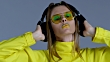 Blond high fashion model in bright stage make-up, wearing yellow sunglasses and black leather gloves, listens to music in big wireless headphones. Close-up. Fashion Video. Slow Motion. 4K 30fps ProRes 4444