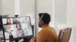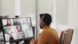 During a video conference, a young businessman gestures as he explains a project idea. Attentive colleagues listen as the man discusses his ideas.