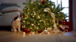 Slow motion of cat sniffing fallen decorated christmas tree in living room