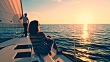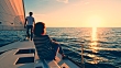 Wide shot of a man walking to a boat's bow while his wife is enjoying the sunset from a deck of a sailboat sailing the sea. The clip was color graded to achieve a special look. Shoot in 8K resolution.