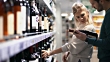 Closeup of early 30's couple doing some home shopping in local supermarket. They are walking down wine aisle and choosing a bottle of red wine. Side view. 4k video