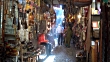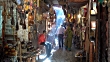 Customers walk through the winding labyrinthof a Marrakesh souk. The sun seeps through slatted roof shades, illuminating the dusty air.