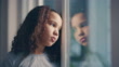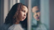Depression, sad or mental health orphan by window in house interior, children home or autism orphanage community room. Zoom on thinking girl, face or lonely kid with stress or anxiety in social care - 4K stock video