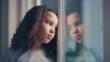 Depression, sad or mental health orphan by window in house interior, children home or autism orphanage community room. Zoom on thinking girl, face or lonely kid with stress or anxiety in social care
