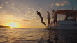 Wide shot captures jubilant mid-adult and mature friends enjoying their leisure time as they dive into the shimmering water from a yacht at sunset. Their casual swimwear and spirited jumps reflect a carefree escape, set against an amber-hued horizon.