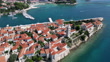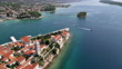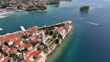 Drone shot of headland on Rab Island with houses rooftops and marina with boats, trees and greenery all over, the greenest island of the Adriatic Sea