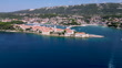 Headland on Rab Island with houses and marina with boats, hills with tree area, the greenest island of the Adriatic Sea, drone view
