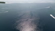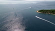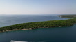 Drone shot of headland on Rab Island with trees and greenery all over, boats cruising on water surface, the greenest island of the Adriatic Sea