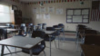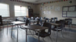 Forward tracking shot an empty classroom filled with unfilled student desks.