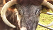 CLEAN: Exterior shots close up shot of head of English Longhorn cow, tagged and wearing GPS tracker under neck in Epping Forest, England on Wednesday 15th March 2017.