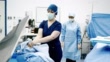After a surgical procedure, a female surgeon removes her operating gown and disposes of it in a garbage can. A surgical nurse is waiting in the background to disposes of her operating gown.