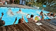 Wide handheld shot of four men jumping into the pool together at a party while their friends in the water are cheering for them. Shot in Slovenia.