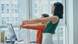 Group of diverse colleagues in casual clothing taking a break practicing stretching exercises to promote wellbeing and an active lifestyle in modern office. Sustainable business and finance concept.