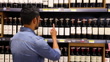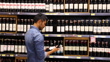 Handsome man choosing a wine from the retail display at the supermarket - Zoom out shot - consumerism concepts