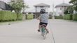 Happy asian boy riding bicycle on the street, He is wearing bike helmet for safety.