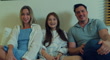 Happy family young dad, mom and daughter use phone video call online to friends spend time sitting on sofa in living room at home at night. Family happy moment. - 4K stock video