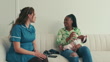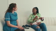 Young pregnant female nurse sitting in a living room with a new mother and her baby girl. They are at the mothers home in Sedgefield, North East England. The mother is feeding the baby from a bottle.
