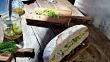 Making a snack of pickled herring with onion and cucumbers on big piece of bread
