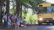 A multiracial group of elementary students of varying ages crowd together and wait in queue to board their school bus at the school bus stop in their rural neighborhood.