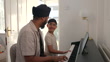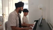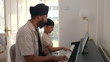 Side-view of a mid adult father teaching his real young son how to play the piano. They are side by side together in the living room at their home in Newcastle, England. The father and son are Sikh, and they are both wearing turbans with casual clothing.Images are available similar to this scenario.
