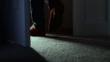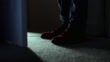 Low angle shot of a man's feet as he enters a dark room, stands for a while then closes the door. He is wearing casual tan shoes and denim jeans. Dolly shot.