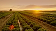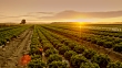 Dolly shot of rows of lettuce growing on fields in the countryside. Shot taken at sunrise.