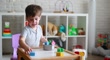 Little happy boy playing with toys in his room, makes food from toys