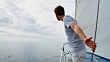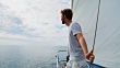 MS man looking out over mediterranean sea on classic wooden sailing yacht - HD stock video