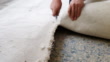 Close up on man's hands removing old carpet from floor