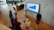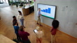 High angle view of a mature man giving presentation to colleagues at a modern office. Businessman sharing project details and graph over television screen with team at coworking office.