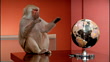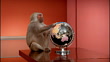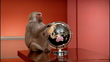 Medium shot baboon sitting on table spinning globe / pushing globe away - HD stock video
