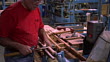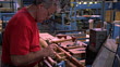 Medium shot man measuring and using lathe to shape baseball bats at Louisville Slugger Factory / Kentucky - HD stock video