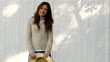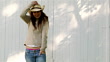 Medium shot woman wearing straw cowboy hat standing in front of barn / removing hat and mussing hair / smiling at camera - HD stock video