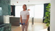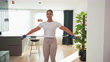 Morning routine. Mixed race woman having a healthy lifestyle by exercising using weights for her arms.