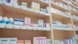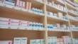 Wide low angle dolly shot of the neatly stacked medicine containers and boxes on the shelves at the drugstore. Shot in Slovenia.