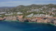 Buildings and Landmarks: Aerial of Panning on tourist resort on cliff by sea during sunny day