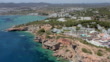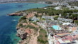 Aerial: Panning on tourist resort on cliff by sea during sunny day - Ibiza, Spain - 4K stock video