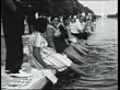 1963 MONTAGE people sitting at the edge of the Reflecting Pool with their feet in, man in suit taking his feet out of the water and drying them, people dispersing after the speech / Washington, District of Columbia, United States