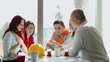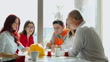 Experience the positivity and collaboration in a modern office with this engaging stock photo, featuring a female manager, two young female creative employees, a young working man in a vest, and a middle-aged general manager having a fun and positive meeting. They are sitting at the table in a modern office, engaged in conversation. The office's large windows allow sunlight to shine through, creating a bright and uplifting atmosphere.