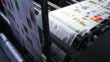 Medium high angle locked down shot of the colorful paper travelling across the printing press in the printing factory. Shot in Slovenia.
