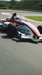 A racing car driving at high speed on a motor racing track. The camera is moving in front of the racecar and is pursued by it.