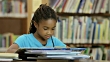 Cute elementary age girl of African descent reading a book by herself out loud at a table in the public library surrounded by a large stack of books.